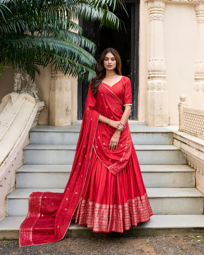 Perfect for festive occasions and weddings, this lehenga set offers timeless elegance with exquisite craftsmanship.