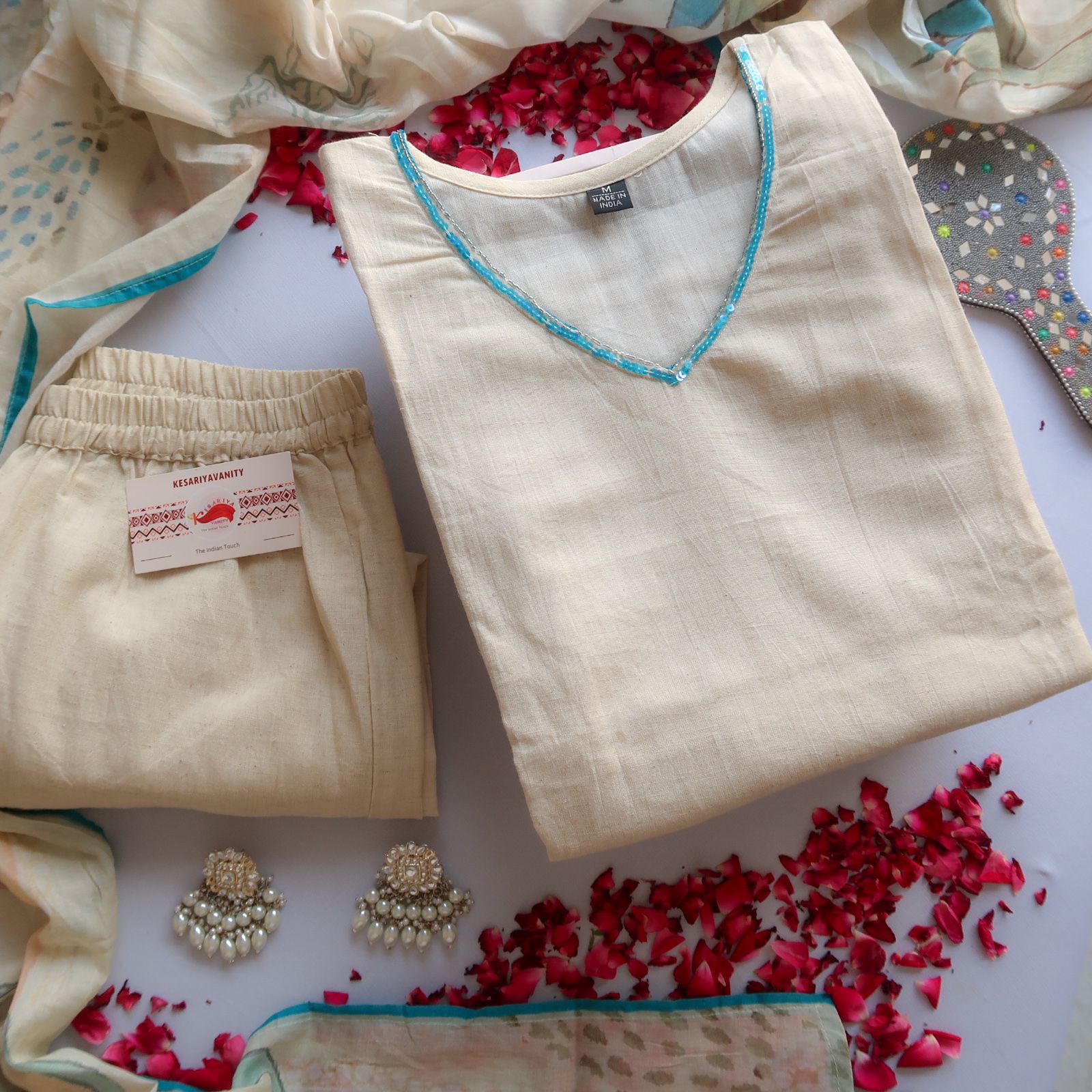 Introducing our Premium Three-Piece "Ivory Radiance Suit Set," a perfect choice for festive and special occasions. The kurta, in a graceful off-white shade, features exquisite sequin detailing along the V-neckline and the hemline, both front and back, adding a subtle shimmer to the ensemble.