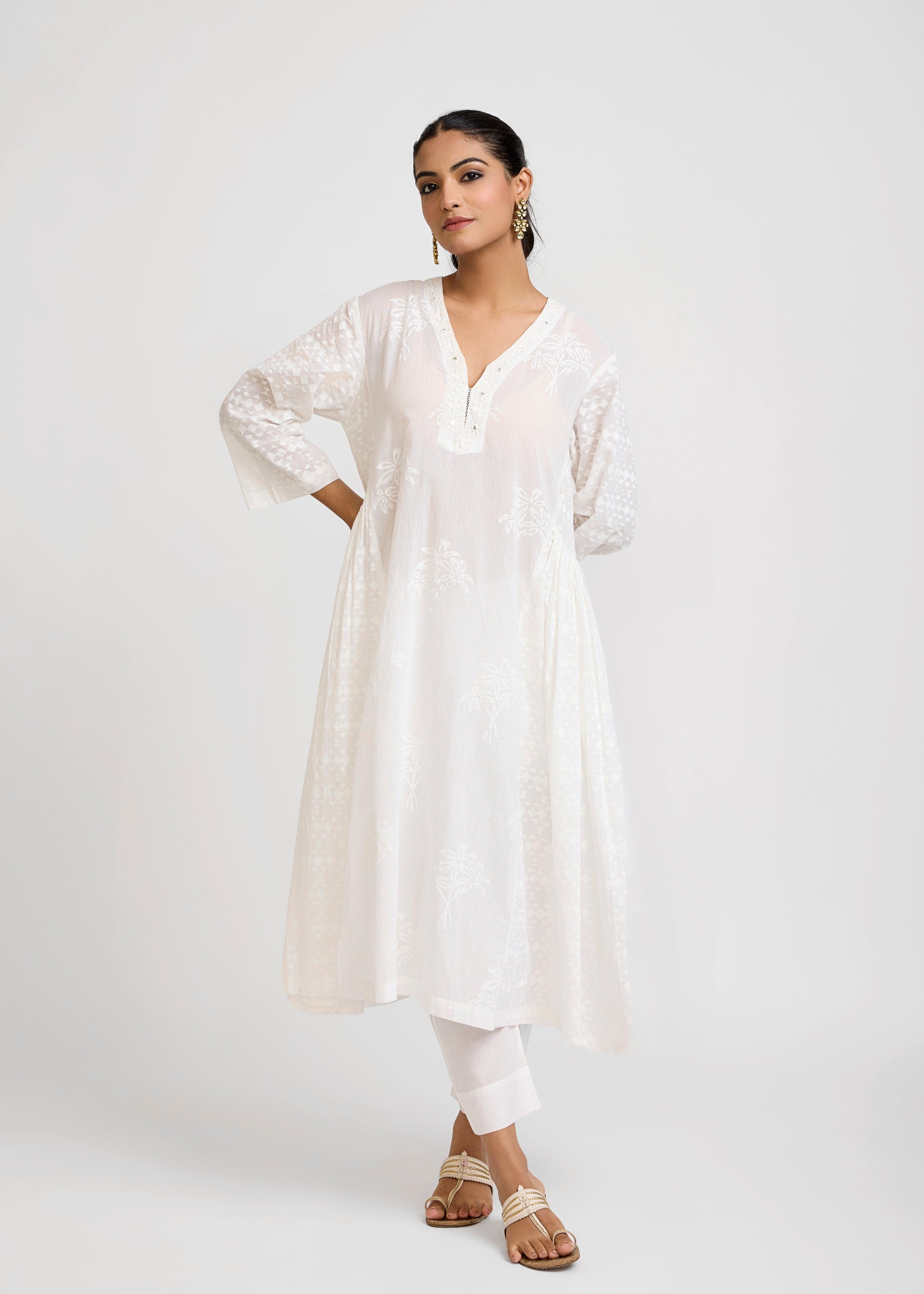 Channel effortless grace with this pristine white cotton kurta, designed to embody purity and timeless charm. Made from soft voile cotton, it features khadi-inspired prints that add subtle texture, while delicate embroidery at the neckline enhances its refined appeal.
