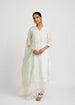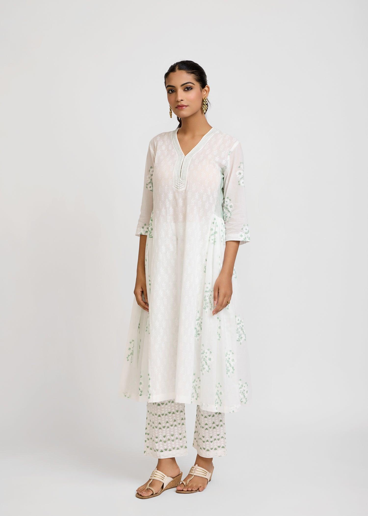 Exude effortless charm with this soft voile cotton kurta, designed in a graceful calf-length silhouette. The delicate white khadi-inspired print adds a touch of timeless elegance, while subtle green stitch accents along the neckline and side panels create a refined contrast.